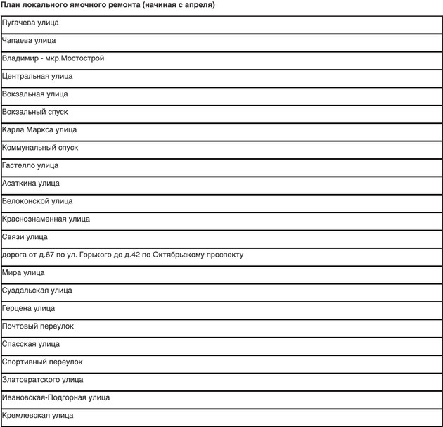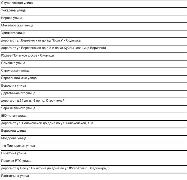 Публикуем перечень улиц, где будет проведен ямочный ремонт. В управлении ЖКХ администрации города Владимира подчеркивают, что этот перечень может быть изменен или дополнен в зависимости от оперативной ситуации.