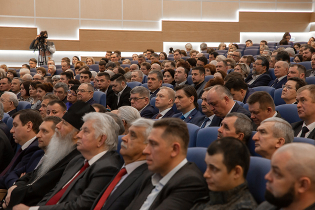 В самом большом зале в здании областного правительства, заполненном до отказа, вместе с депутатами ЗС, собрались сенаторы и депутаты Госдумы, члены областного правительства, руководители муниципалитетов, общественники, духовные лица, многочисленные журналисты. Были приглашены в качестве особо почетных гостей участники СВО и гости из подшефного Докучаевска.