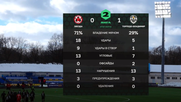 Статистика матча красноречива. Владение мячом: у «Звезды» - 71%, «Торпедо» - 29%. Удары по воротам: у «Звезды» - 18, у «Торпедо» - 5. Удары в створ: у «Звезды» - 9, у «Торпедо» - 1 (один!). Кто забил и победил? «Торпедо»!