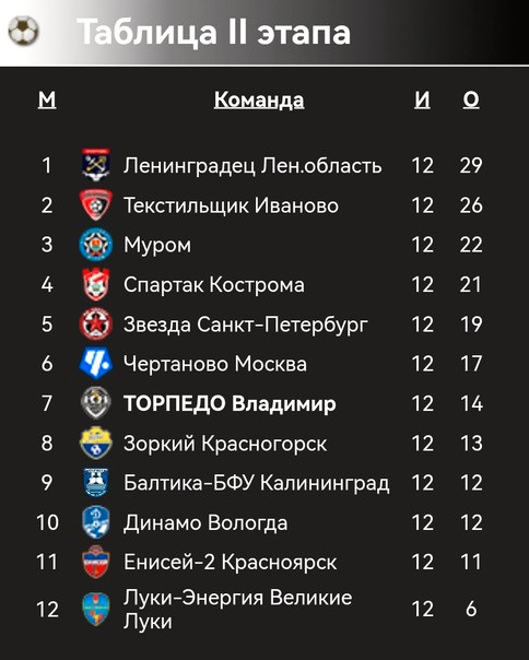 Итак, «Муром» выиграл во втором туре. И теперь тройка лидеров в группе 2А Второй лиги ФНЛ выглядит так: на первом месте – «Ленинградец» - 29 очков, на втором «Текстильщик» - 26 очков. Они и считаются основными претендентами на выход в первый дивизион ФНЛ. А третьим за ними идет «Муром» - 22 очка.
