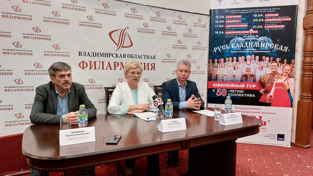 О гастролях ансамбля, который по праву считается «визитной карточкой» нашего региона, на пресс-конференции во Владимирской областной филармонии рассказали заместитель министра культуры области Елена Огудина, директор ансамбля Эдуард Ахметов и художественный руководитель Николай Литвинов.