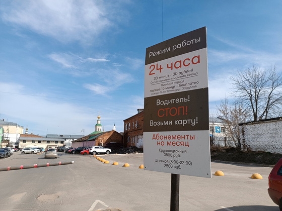 Режим работы платной автостоянки - 24 часа в сутки, гласит информационный щит на въезде. Тариф предельно простой: 30 минут - 30 рублей. Видимо, для случайно заплутавших водителей предусмотрен бесплатный период нахождения на городской земле - 15 минут. Также предприниматели предлагают приобретать абонементы на месяц. В случае, если автовладелец планирует оставлять свою машину только в дневное время, то «безлимит» на месяц будет стоить 2500 рублей, если же водитель решит парковаться и в ночные часы, то абонемент уже оценивается в 3800 рублей.