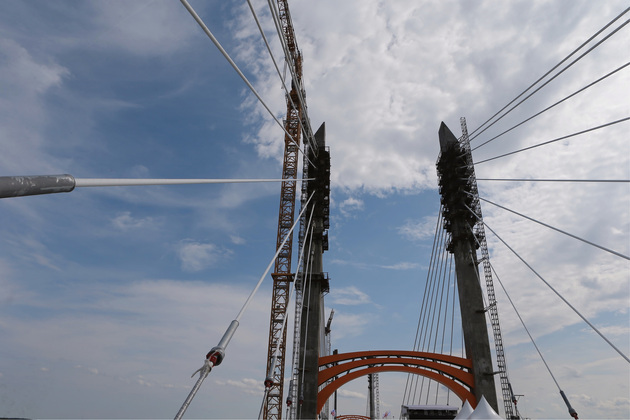 Длина нового сооружения – 1,4 км, а вантового центрального пролета – 254 метра, при этом суммарный вес металлоконструкций – свыше 6,5 тысячи тонн.
