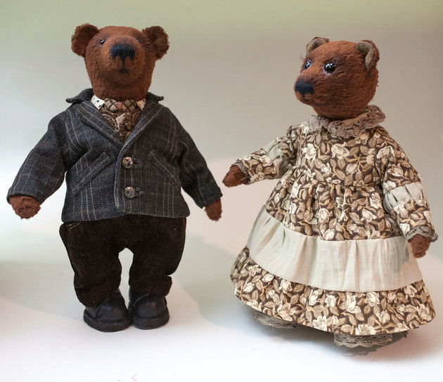 По соседству – высшее медвежье общество: мишки Тедди. Расфранченный кавалер в клетчатом пиджаке, жилетке и вельветовых брюках и его спутница в изысканном платье с кружевным воротом.