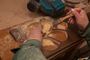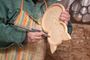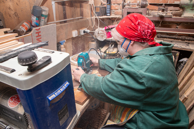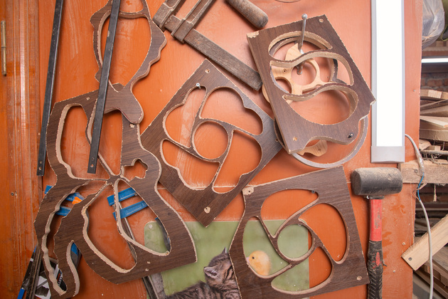 - Сосна, береза, ольха и даже рябина. Древесина обязательно должна быть сухая и чтобы на ней было как можно меньше сучков. Если они есть, небольшие, их вырезают. Ведь когда начинаешь делать выборку, они могут вылететь. Есть такие сучки - табачные, вроде светлые, но вокруг них темный ободочек, вот он вылетит точно. Обычно много материала не закупаем: три-четыре доски и сразу начинаем с ними работать. У нас нет специализированных печек для сушки. Вот лежит береза, ее сушили два года. Только-только начали с ней работать, нам ее дали полусырую.