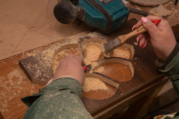 - У меня есть лазер на ЧПУ, пока не запускала, есть в планах. Пока освоила сам станок. Решила перейти на ручной фрезер. На ЧПУ работа не идет быстрее. Задается определенная программа, она долго режет. Если в ручном формате, затрата общего времени на изготовление, например менажницы, - порядка двух часов, то станок за это время ее лишь вырежет, после чего все равно надо еще шлифовать. На станке можно делать крупные изделия, картины, столешницы. Лучше производить 3D-обработку, например, ключницы. Это все обязательно необходимо делать со щитами, ведь цельное дерево имеет свойство гнуться, как коромысло. Еще вариант - гравировка. По этому принципу делают заготовки для печатных пряников. Когда иконостасы делаем с мужем, я на ЧПУ делаю накладки, а он - все остальное.