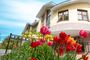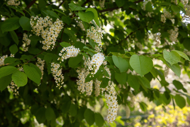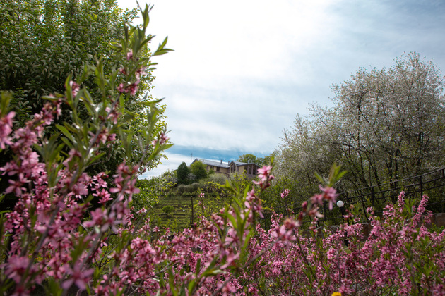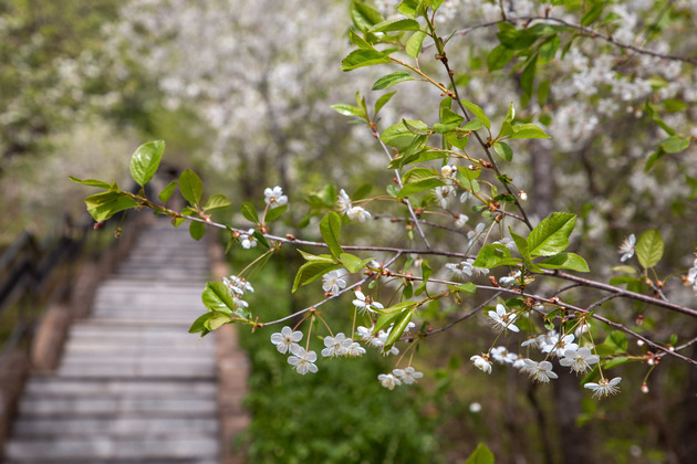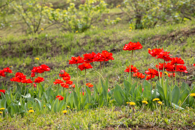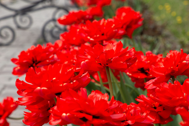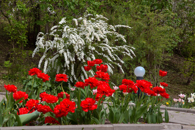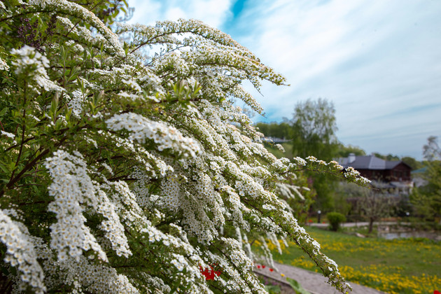Рабатки красных пионовидных тюльпанов, горящие веселыми огоньками в лучах майского солнца, – яркие акценты свадебного наряда. Чуть поодаль «цветут в унисон» магнолии, источая ароматы сладковато-ванильных и лимонных ноток. Тут же россыпи соцветий спиреи, такие густые и обильные, будто растения утопают в снегу.