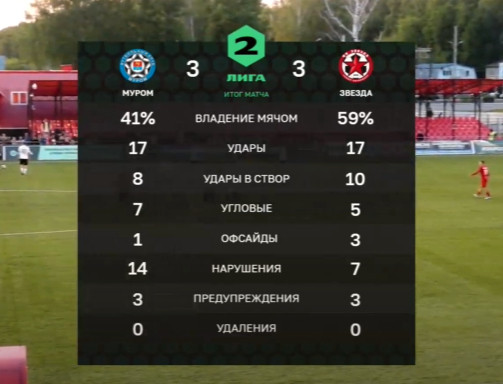 А тем временем, ослабленная оборона «Мурома» уже в компенсированное время первого тайма (45+) дала сбой. «Звезде» удалось забить «в раздевалку» хозяевам поля два мяча.