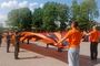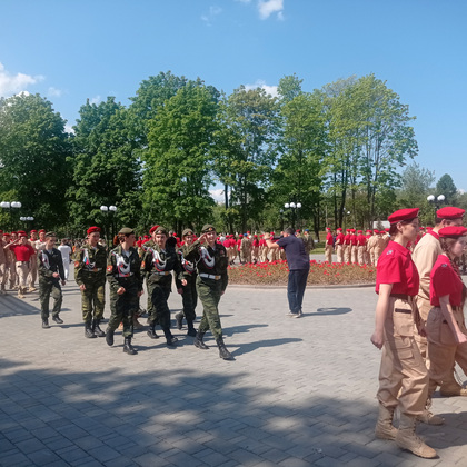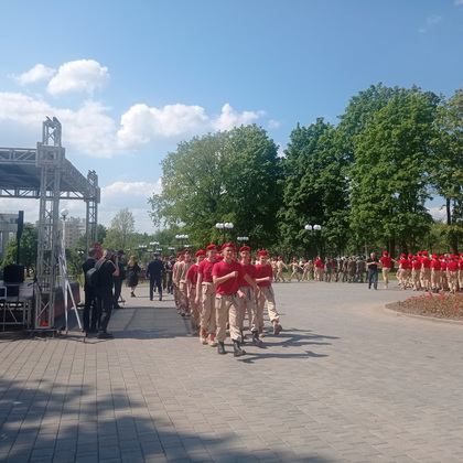 Ребята прошли колоннами мимо сцены, стараясь держать равнение и чеканя шаг. Это было непросто, учитывая и важность момента, и волнение юнармейцев, и тот факт, что мошкара в парк Патриот совершенно немилосердно облепила участников (большой привет мэрии, сэкономившей на обработке территории).