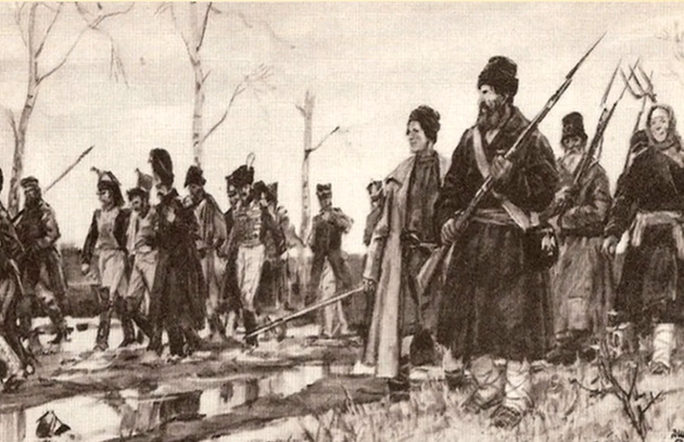 «Мы прибыли сюда утром, и здесь уже находилось человек с двести французских пленных, ночевавших в деревне. Они как раз должны были отправляться в дальнейший путь, а посему их построили. С обеих сторон пленных охраняли бородатые ополченцы с пиками.