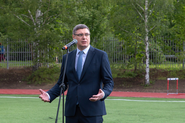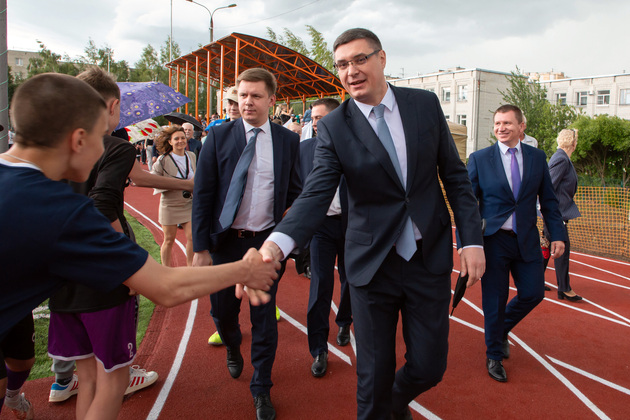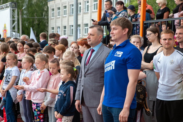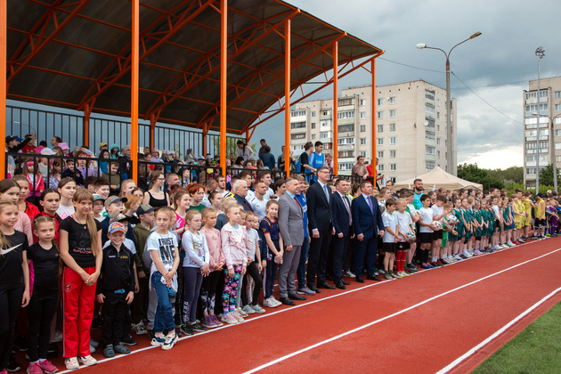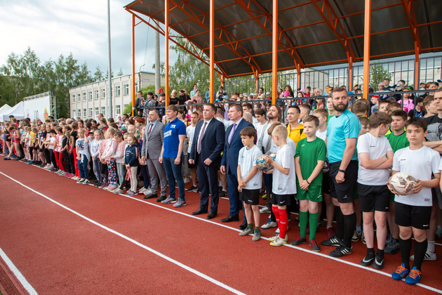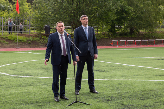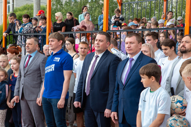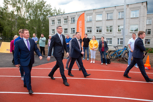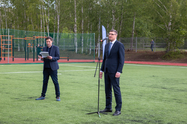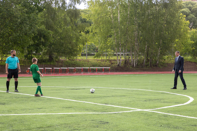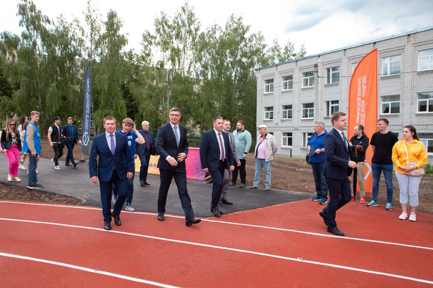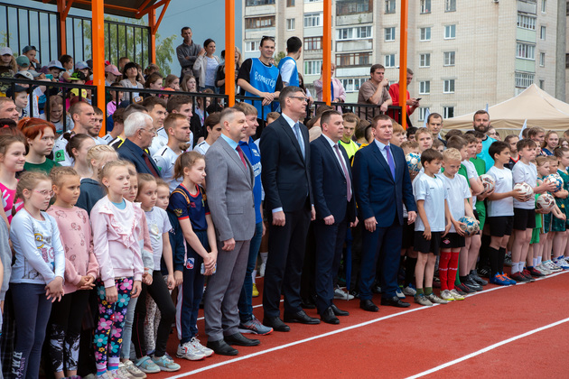 Александр Авдеев на новом футбольном поле принял первый символический пас от юного футболиста Саши из Юрьевца. А потом вместе с главой города Дмитрием Наумовым прошел на баскетбольную площадку, где руководители области и города закинули мяч в корзину. А вокруг них опробовали юные спортсмены.