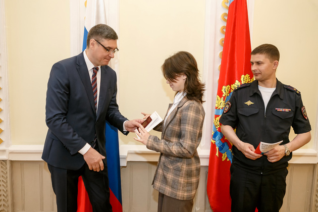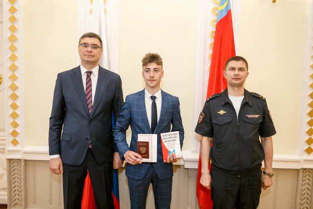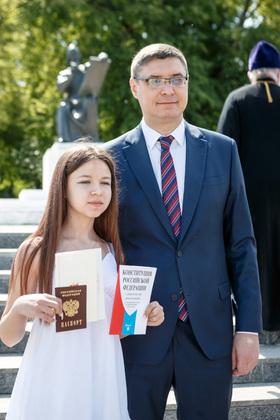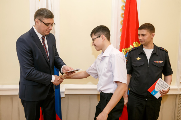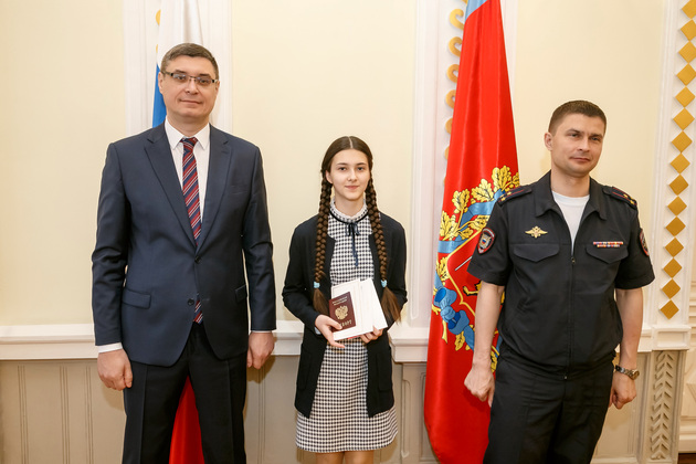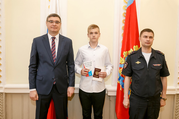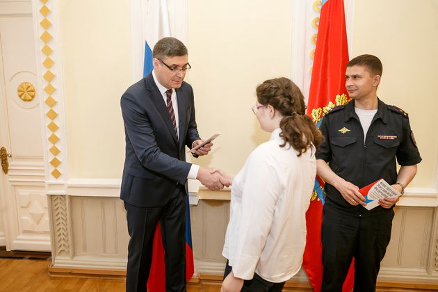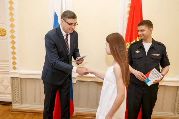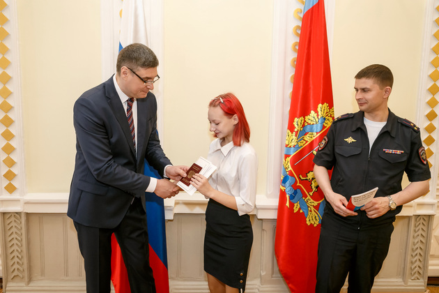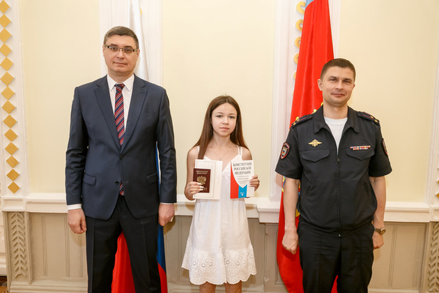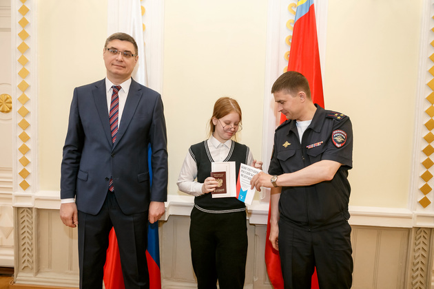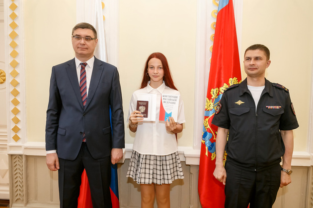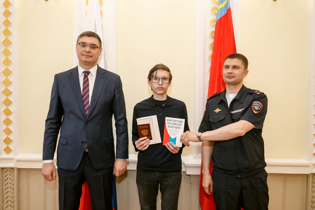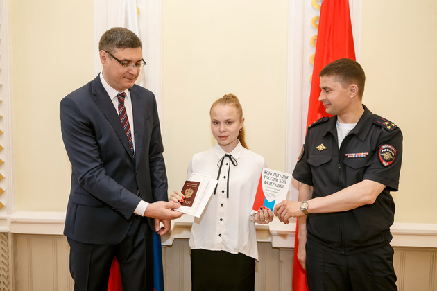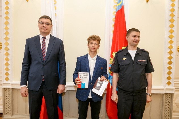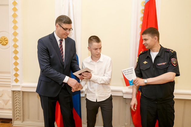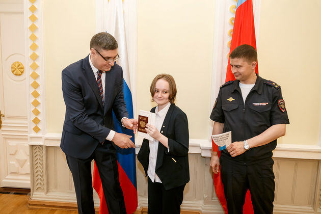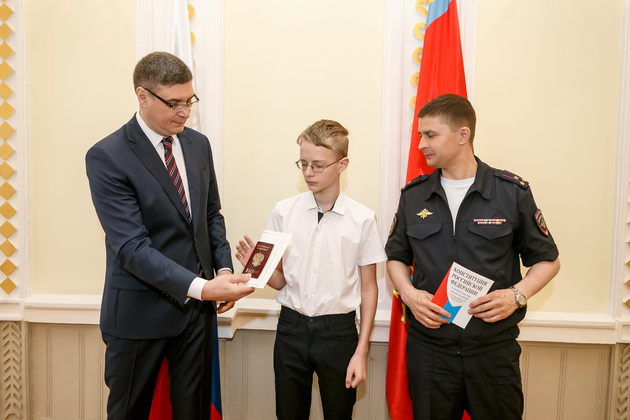 В преддверии Дня России губернатор Александр Авдеев вручил паспорта 14-летним ребятам, проявившим себя в учёбе, спорте и творчестве. Главный документ гражданина РФ из рук губернатора получили 29 школьников.