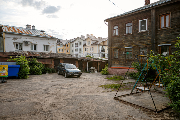 Мы подходим к дому № 2. Татьяна рассказывает, что до революции все дома до Ерофеевского спуска принадлежали купцам Васильевым. Это место называлось «Васильевским кварталом». Но стал он вотчиной этого семейства только в конце XIX века. На самом деле ни одно из этих зданий сами Васильевы не строили. Они скупали здания, построенные другими богатыми купеческими семьями. В частности, дом № 2 построен в начале XIX века купцами Петровскими. Он был двухэтажным с мансардой посередине.