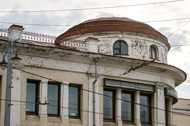 – А видите угловую часть торговых рядов, которая выше по этажности и имеет ротонду? Это перестройка здания 1912 года авторства известного владимирского архитектора Сергея Жарова. Здесь когда-то находились лавки купцов Ионова и Платонова. Они обратились в городской магистрат с просьбой перестроить торговые лавки, сделать их не типовыми, а оригинальными, более просторными. Купцы были людьми состоятельными, и отказать им не посмели. Основная часть торговых рядов в стиле классицизма, а это модерн. Многие ли из вас обращали внимание, что ротонда украшена лепниной – танцующими античными девушками? – Татьяна указывает на верхнюю часть строения.