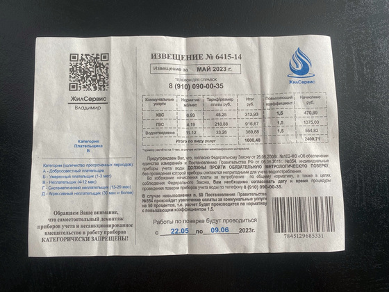 Первое, на что следует обратить внимание, так это на то, что документ не содержит никаких данных о плательщике, с которым заключен договор с ресурсоснабжающей организацией. На листке просто написано: «Извещение [номер] за май 2023 г.», а ниже расположен телефон для справок, справа – эмблема компании «ЖилСервис» (ответственной за эти «квитанции»). Также в листовке есть таблица с расчетом платы за одного человека в случае истечения межповерочного интервала. Правда, под звездочкой указано, что это пример. Интересная градация слева – категории плательщика – от «добросовестного» до «агрессивного».