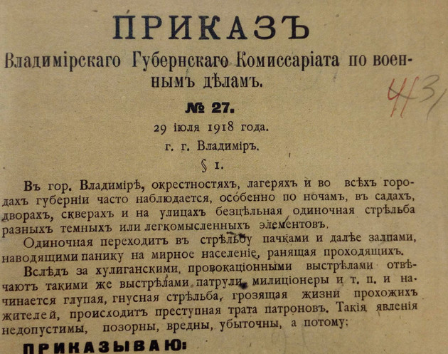 «В гор. Владимире, окрестностях, лагерях и во всех городах губернии часто наблюдается, особенно по ночам, в садах, дворах, скверах и на улицах бесцельная одиночная стрельба разных темных и легкомысленных элементов.