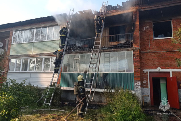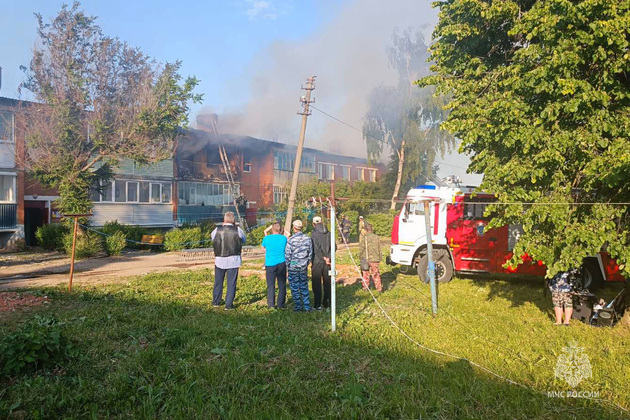 “Наблюдалось открытое горение квартиры на втором этаже и кровли здания по всей площади”, – рассказали в пресс-службе ведомства.
