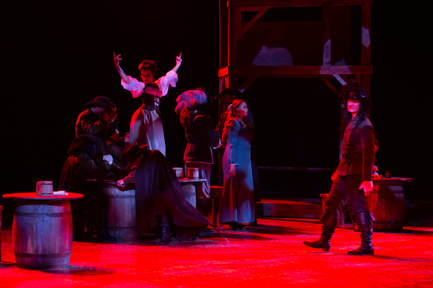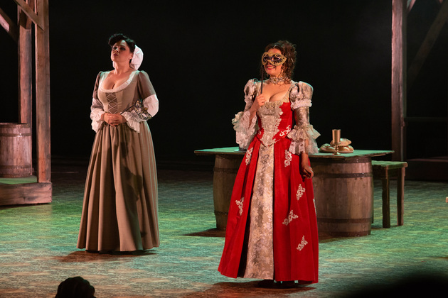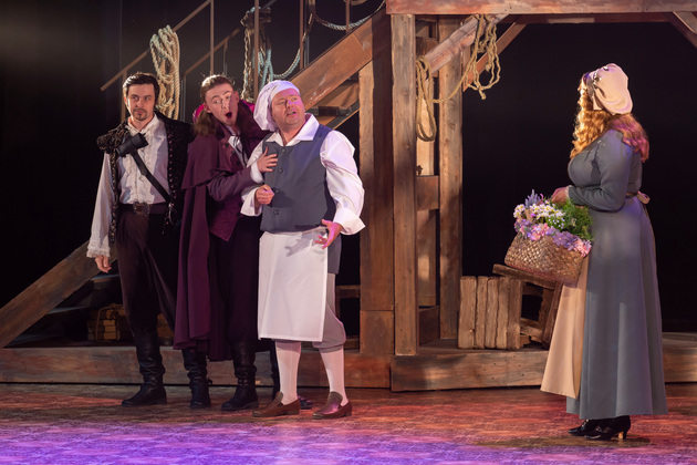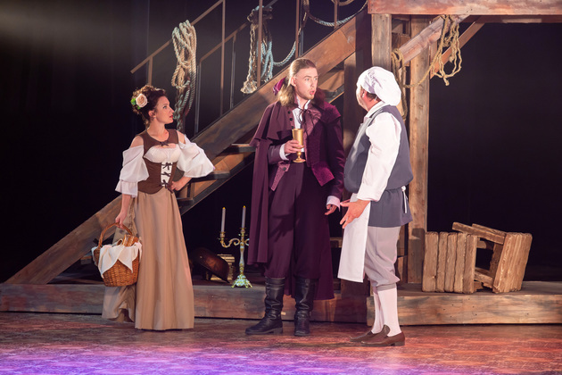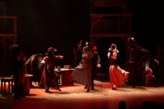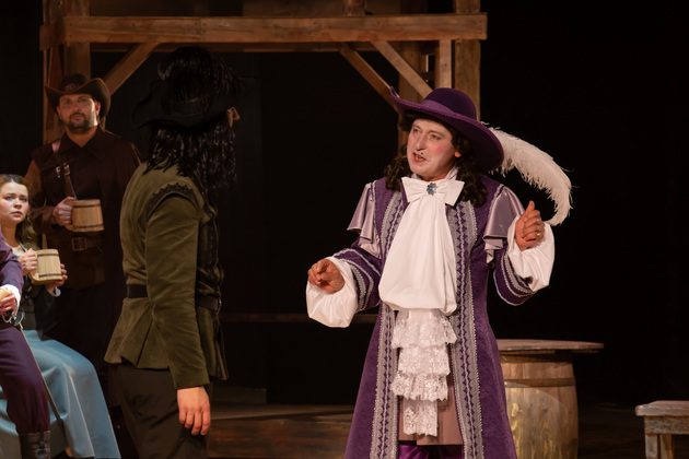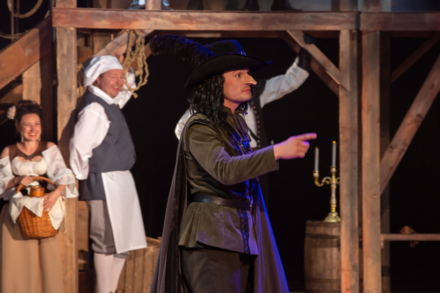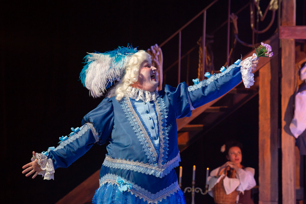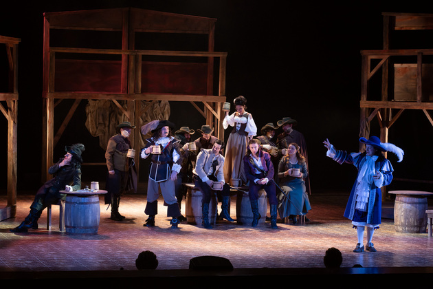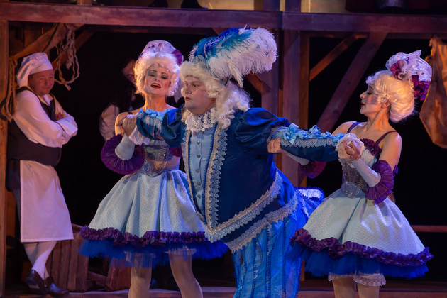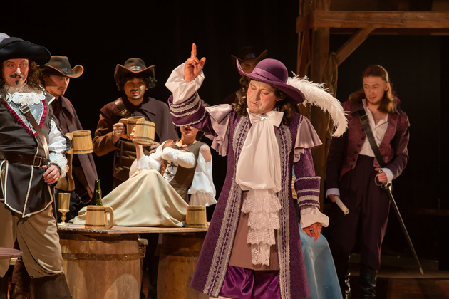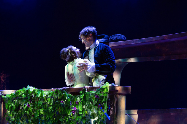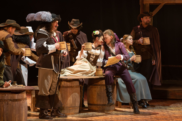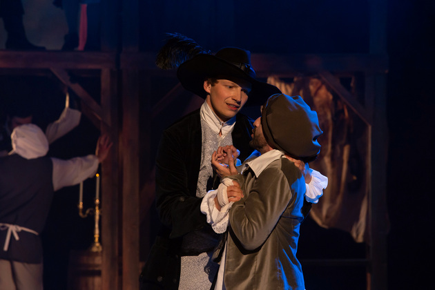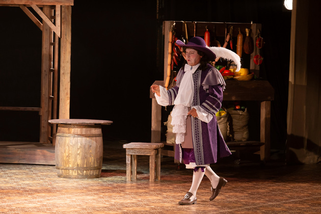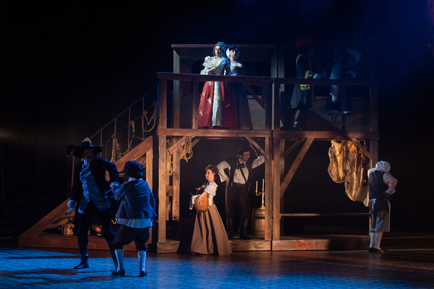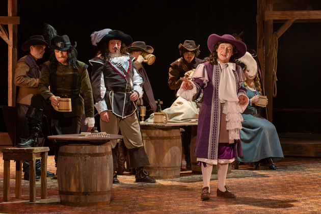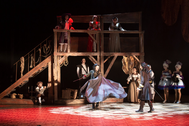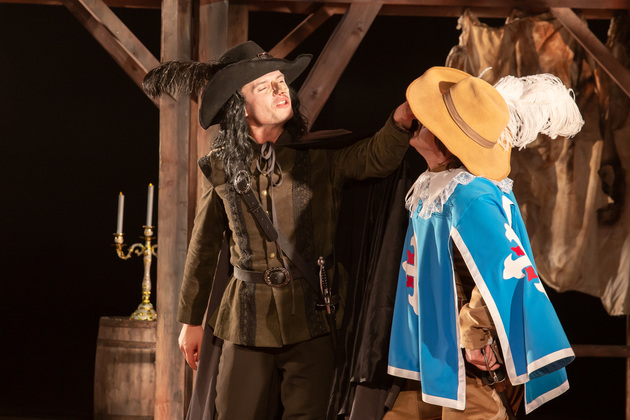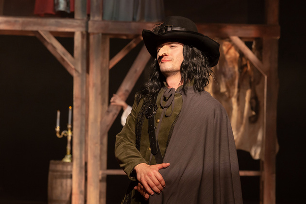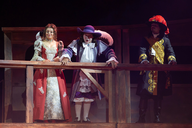 Интересной находкой выглядит сквозной образ Сирано в детстве – исполняет юный Макар Аладышев. Среди других персонажей сочно сыгран образ кондитера Рагно: актер Анатолий Шалухин порой срывал аплодисменты по ходу действия наравне с ведущими героями. Пущей театральности происходящему уместно добавляют периодически появляющиеся актрисы. А мужскую энергию выражают гасконские гвардейцы...