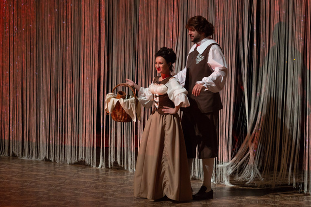 Владимирский «Сирано» потребовал задействовать на сцене 35 актеров, как раз большинство молодых и среднего возраста (так уж по пьесе – стариков в ней нет), а зрителя пригласила сопереживать диалогам и массовым сценам в течение трех часов со множеством действующих лиц. Антракт был только после первых двух часов насыщенных событий и меняющихся сцен, которые знакомят с героями и подводят к часовой кульминации и развязке.