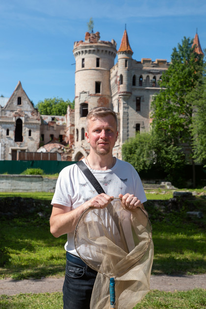 Руслан одиннадцать лет преподавал во Владимирском госуниверситете, в его активе – около тридцати научных публикаций по зоологии. Сейчас он занимается различными просветительскими проектами в этой сфере. Мы договорились о встрече в парке возле замка Храповицкого в поселке Муромцево Судогодского района. Колоритный памятник архитектуры конца XIX - начала ХХ века, дендрарий, лужайки, озеро. Здесь приятно гулять под сенью деревьев в жаркий летний денек. Вокруг беспрестанно снуют бабочки, стрекозы, жуки и мухи – те самые «клиенты» исследователя. Энтомолог вооружился сачком, чтобы рассказать подробнее о будущих находках.
