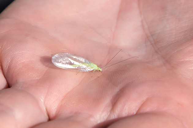 Руслан демонстрирует пойманное насекомое с нежно-зеленым отливом, с прозрачными крыльями и глазками золотистого цвета.
