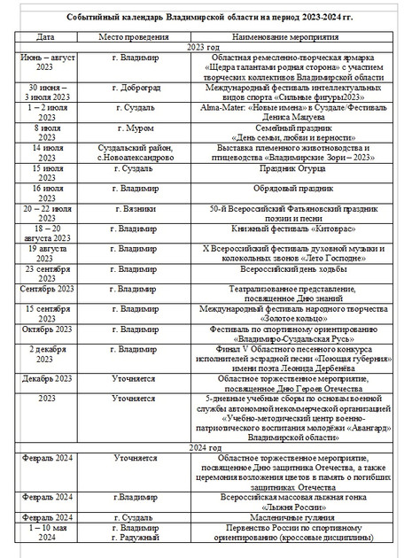 Событийный календарь Владимирской области в формате текстового документа можно скачать по ссылке.