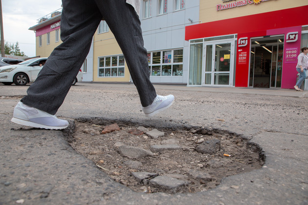 По приезде мы увидели, как уличные торговцы размещают свои палатки прямо на парковочных местах, в ямах, вся дорога усыпана асфальтовой крошкой. Кое-где заметен несвежий ямочный ремонт, который не сильно меняет общую картину. Ямы на улицах периодически заделывают, говорит посетительница одного из магазинов. Однако производится ремонт весьма креативным способом – камнями и кусками кирпичей.