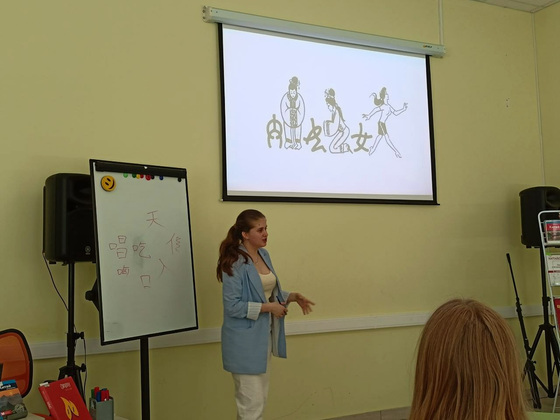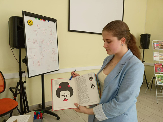 Урок под названием «Занимательный китайский» вела молодой специалист из Московского государственного университета имени М. В. Ломоносова Александра Пронькина. Она рассказывала о китайском языке, о правилах написания иероглифов и их произношения. Александра закончила первый курс института стран Азии и Африки на специальности "Востоковедение и африканистика".