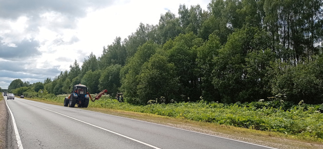 - В этом году нам предстоит обработать порядка 130 га, на которых произрастает борщевик Сосновского. Сейчас идет второй цикл его уничтожения, первый был в мае, опрыскивали пораженные обочины гербицидом сплошного действия. Часть борщевика успешно ликвидировали. Сейчас произошел так называемый подрост. Это второй слой, потому что зонтичные растение произрастают ярусами. В данный момент производим механизированное окашивание именно отдельно выявленных очагов. Обрабатываем, как механизировано с помощью трактора, так и отдельно растущие кусты вручную: дорожные рабочие подрубают корневую шейку, чтобы борщевик погиб.