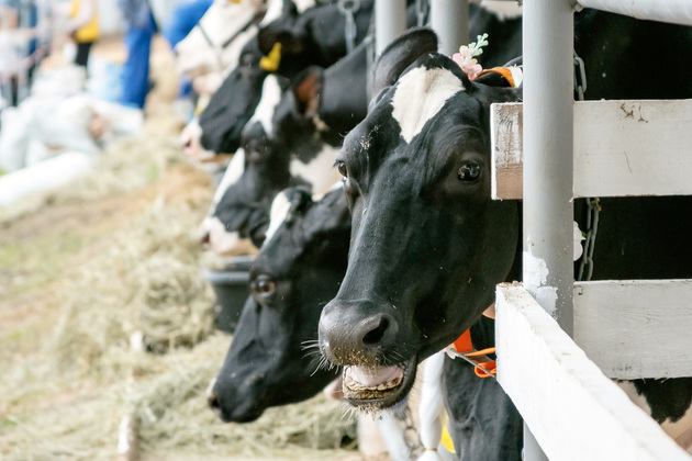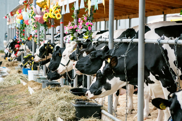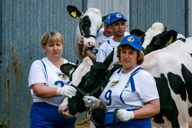 «Поголовье общее – 3,5 тыс. голов. Занимаемся только производством молока. Участие принимаем уже много лет. В 2016 году взяли золотую медаль. В прошлом [2022] году мы выиграли первое испытание. В этом году у нас представлены первотелка и корова второго отела. Беленькие подобрались в масть, чтобы пара была. Средний надой у коров – от 50 до 60 литров, жирность – до 4%, белок – 3,3%».