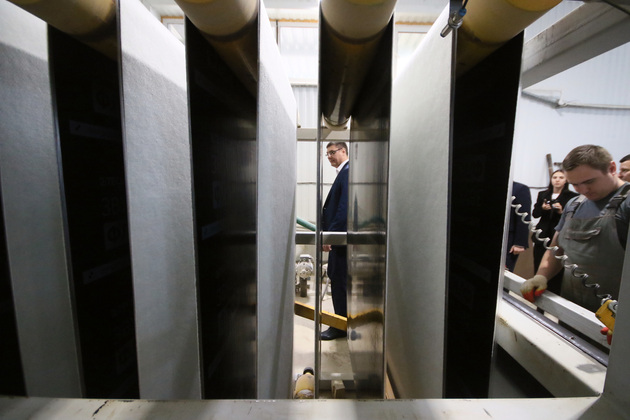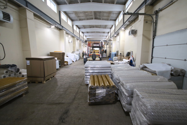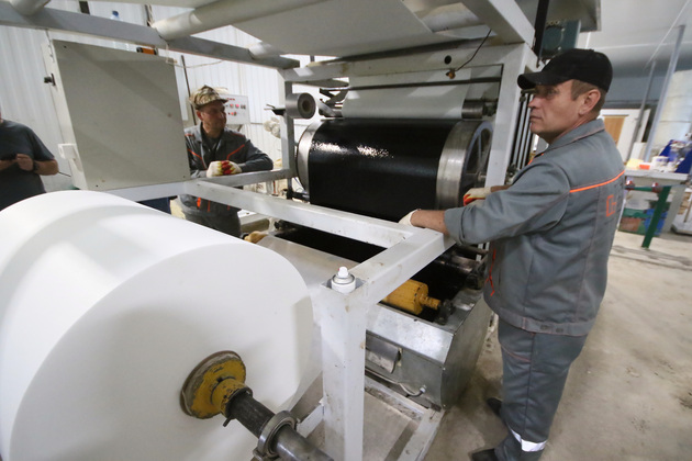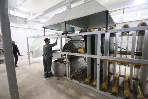 Главный технолог предприятия Николай Лоншаков показал журналистам уникальную технологическую линию по производству звукоизоляционной вязкоэластичной мембранной продукции шириной 1200 миллиметров. Особенность оборудования в том, что оно собрано на заказ. Одна такая линия в Испании, а вторая - у нас, в Судогодском районе.
