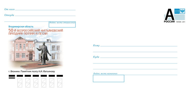 Конверт с изображением памятника поэту-песеннику Алексею Фатьянову выпущен тиражом 250 тысяч экземпляров. Его можно приобрести в почтовых отделениях Владимирской области, сообщила пресс-служба Почты России.