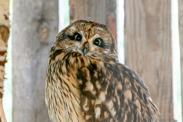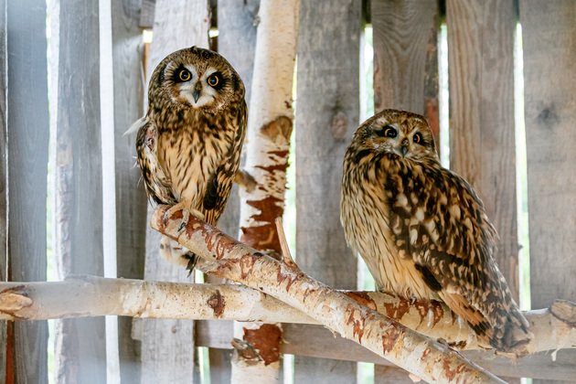 А вот ближайшие родственники неясыти - болотные совы, самец и самка. У девочки неправильно сросшийся перелом крыла, а у мальчика ампутирована лапка. Их сюда доставили уже в таком виде. Ангелина надеется, что совы смогут создать семью и вывести потомство. Зоозащитники собираются соорудить для них домик.