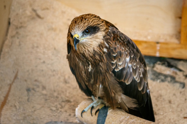 Ангелина познакомила меня еще с одной хищной птицей - черным коршуном по имени Панкрат. Его нашли в сентябре прошлого года в селе Гнездилове Суздальского района. Птица не могла летать. Всему виной - неправильно сросшийся перелом тазобедренного сустава. Панкрат был вымазан в химикалиях и получил химический ожог. К тому же у коршуна диагностировали воспаление легких. С наступлением осени эти птицы мигрируют в южные края. Неудивительно, что Панкрат заболел в холодную погоду.