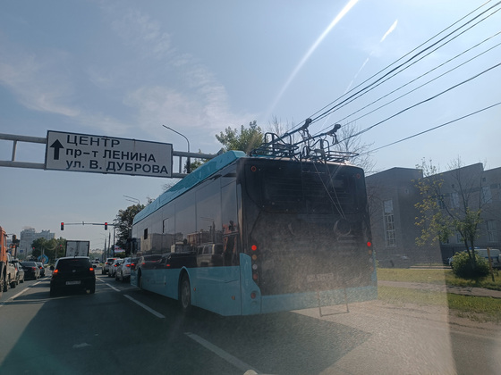 В среду, 26 июля троллейбус со спущенными штанговыми токоприёмниками ("рогами") был замечен на пекинке в районе гипермаркета “Лента”. При ближайшем рассмотрении оказалось, что на капоте новинки размещен шильдик местного производителя - собинского завода “Волгабас”.