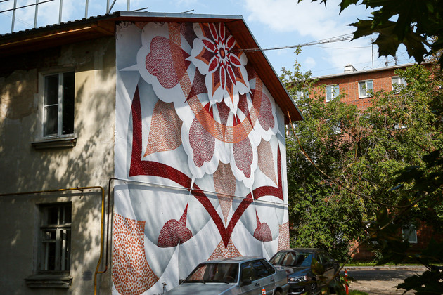 Мстерская вышивка, абстракции и символизм. Нашу экскурсию мы начали с готового арта от Анастасии Petra (город Барнаул), который находится на доме 25 Октябрьского военного городка. Объект называется «Цветы жизни» и символизирует союз мужской и женской энергии. «Изогнутые линии лепестков символизируют женственность, в то время как острые, заостренные кончики символизируют мужественность. Женщина это божественный, чувствительный, благоухающий цветок. Это единственный Цветок на планете Земля, дарующий человеку жизнь. И, раскрываясь лишь однажды полной красоты цветка бутон наполняет воздух волшебным ароматом любви. Мужчины же бережно охраняют цветок жизни и подпитывает его своей энергией и заботой» - сказано в описании работы на странице фестиваля в соцсетях.