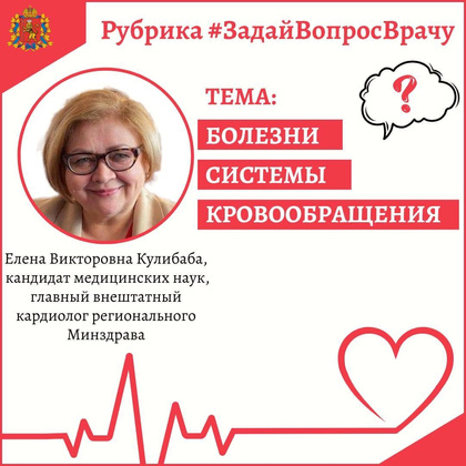 На этой неделе гостем рубрики выбрана главный внештатный специалист минздрава, врач-кардиолог Елена Викторовна Кулибаба. У нее 34-летний стаж работы, высшая категория. Елена Викторовна – кандидат медицинских наук, училась в Ивановской государственной медицинской академии, работает во владимирской больнице №4, в городском кардиологическом диспансере (возглавляет отделение).