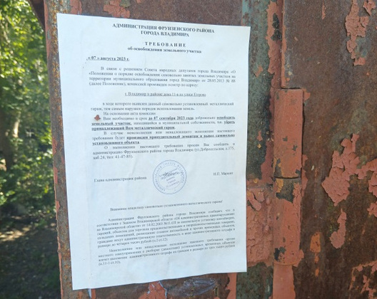 Администрация Фрунзенского района извещает владельцев гаражей, расположенных в районе дома №11в на улице Егорова, о том, что 7 сентября в соответствии с «Положением о порядке освобождения самовольно занятых земельных участков на территории муниципального образования город Владимир» будет производиться их демонтаж и вывоз.