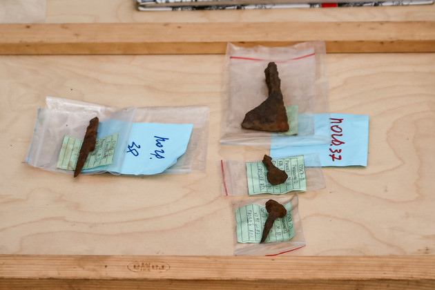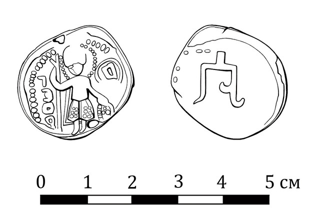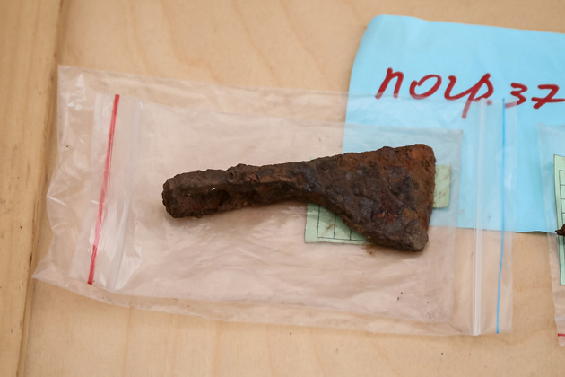 - Этот участок - продолжение прошлогоднего раскопа, - рассказывает Анна Михайловна. - В этой зоне было обнаружено мужское погребение с боевым топориком, набором весовых гирек и фрагментами монет. Погребенный обладал высоким социальным статусом и был связан либо с княжеской администрацией, либо с фискальной системой. Раньше такого человека археологи определили бы как торговца, но со временем этот подход специалисты пересмотрели. Рядом обнаружено еще одно погребение с аналогичным набором предметов. Захоронения разграничены кольцевыми канавками, которые встречаются на разных древнерусских памятниках. Мы также нашли разрушенное современной распашкой мужское погребение. В пахотном горизонте в районе этой площадки было собрано несколько гвоздей. Они свидетельствуют о наличии гробовины, в которую были помещены останки.