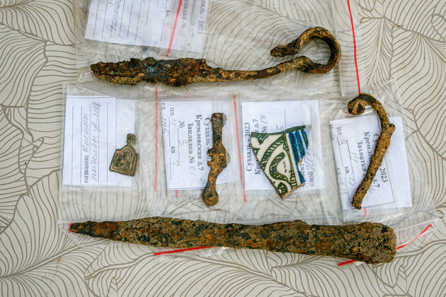 - Здесь в основном находки XII-XIV веков, - говорит Сергей. - Раньше на этом месте располагался Окольный город, оборонительные укрепления которого были возведены при Юрии Долгоруком. Эта часть Суздаля застраивалась во второй трети XII столетия. Мы нашли фрагмент золотоордынской чаши, это так называемая кашинная керамика. А это декоративная накладка на пояс времен XIV века, которая характерна для военного сословия. Еще нашли железный наконечник дротика XII века и небольшую подвесную металлическую иконку XIV века, изготовленную методом литья, стеклянные бусы и другие предметы, которые отражают повседневную жизнь и хозяйственные занятия горожан.