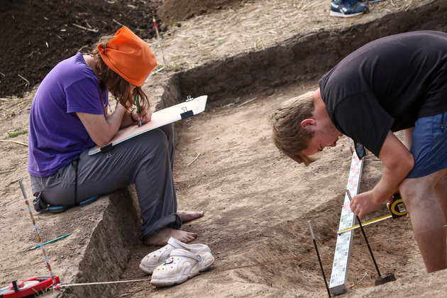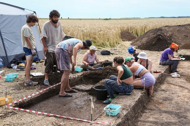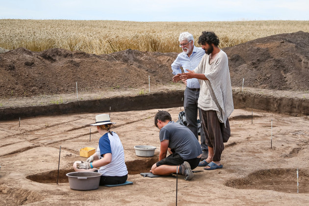 По узкой тропе через поле мы добираемся до археологических раскопок. Здесь разбит небольшой шатер, где можно отдохнуть и укрыться от палящего солнца. На раскопе работает группа студентов-историков и волонтеров из Санкт-Петербурга, а до них были москвичи. Для студентов это летняя практика. Ребята живут неподалеку в палаточном лагере, где можно выспаться и принять душ. Пищу для них готовит полевая кухня. Работа на раскопках, да еще в жаркую погоду - нелегкий труд, требующий усердия и концентрации внимания. Но ребята молоды и полны задора. Тут царит непринужденная атмосфера - общение, смех, дружеские дискуссии. Одежды минимум: шорты, футболка, а многие даже без обуви. Один из парней, одетый в тунику, с бородой и копной волос чем-то напоминает Христа со знаменитого полотна Ива́нова. Явление археолога народу!