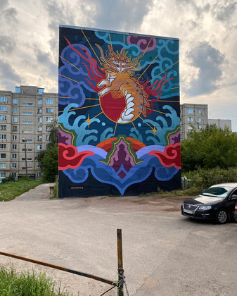 На Безыменского, 1Г, появилась работа «Сияние» с драконом в центральной части композиции. «В работе преобладают фиолетовые оттенки, – отмечает художник. – Сюжет уводит зрителя в мир эмоций и магической тайны. Любуясь рисунком, человек ощущает, как растворяется граница между фантазией и реальностью».