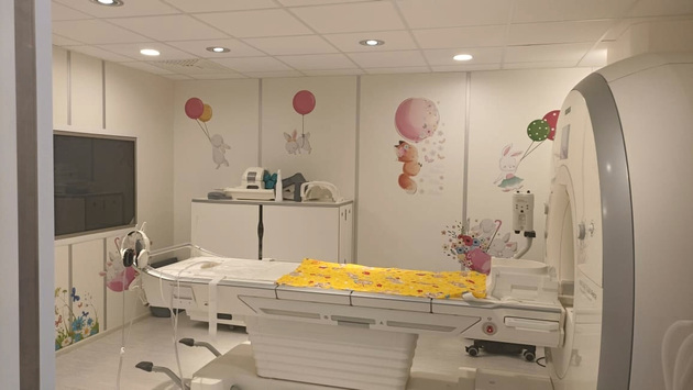Кабинет МР-томографии оформлен так, чтобы было комфортно маленьким пациентам. За счет удобной для пациентов конструкции магнита, благодаря открытому туннелю шириной 70 см и подсветке туннеля вероятность возникновения клаустрофобии снижена до минимума.