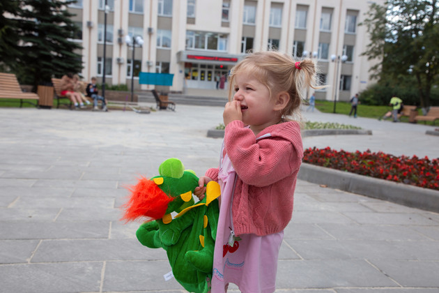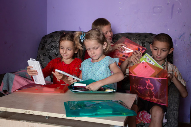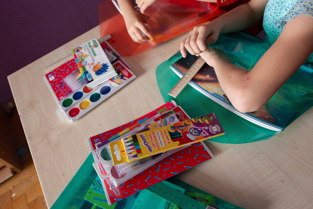Мария встречает инспекторов городского управления соцзащиты населения Татьяну Байкалову и Алину Савинову. Дети с интересом рассматривают подарки - яркие рюкзаки, игрушечных динозавров с конфетами внутри, акварельные краски, фломастеры, пластилин, ручки, тетради, линейки, цветные карандаши и другие канцелярские принадлежности.