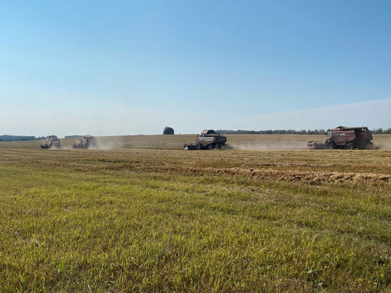 Совокупно убраны культуры с площади 1700 га, средняя урожайность по всем культурам по кругу - 60 центнеров, то есть 6 тонн зерна с гектара. В 2023-м урожайность пшеницы на круг в Суздальском районе достигает 73 центнеров. Тарбаевцам осталось убрать этой культуры около 270 га. Сейчас комбайнеры убирают ячмень, его урожайность - 50 центнеров, осталось - 600 га. Убрали горох. Результат: 40 центнеров на круг, намолотили 1800 тонн. Остались овес и гречиха. Около 30 единиц техники работают в полях, работников - около 40 человек.