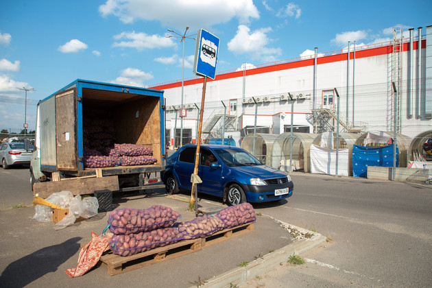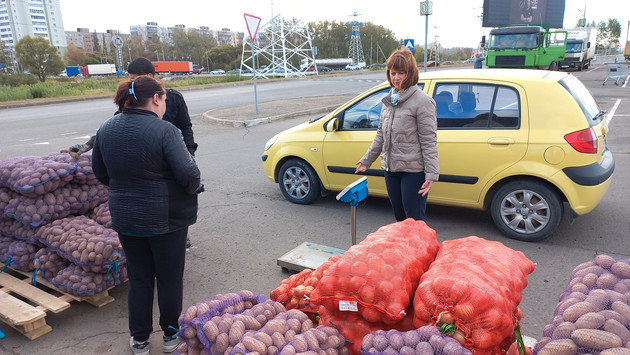 Тем временем останавливается желтый «Хёндэ Гетц», выходит женщина средних лет и приценивается к картофелю. Дама по пути из гипермаркета заметила ярмарку и вспомнила о пополнении запасов на зиму. Решила приобрести сразу три мешка картошки. Водитель фуры взвесил товар, погрузил мешки в багажник, покупательница расплатилась. За всё про всё - 2450 рублей. Сделка состоялась - все довольны и счастливы.