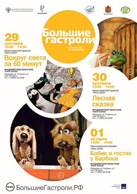 С 29 сентября по 1 октября на сцене Владимирского областного театра кукол свои спектакли покажет Краснодарский краевой кукольный театр в рамках «Больших гастролей». Организовано мероприятие ФГБУК РОСКОНЦЕРТ согласно Всероссийскому гастрольно-концертному плану Министерства культуры РФ.