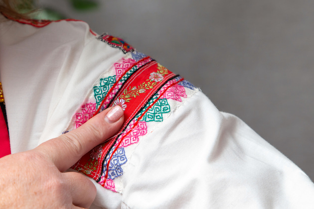 - На мне один из мокшанских национальных костюмов, состоящий из вышитой рубахи, подол которой украшен тесьмой, а также фартука, пояса, бус. На голове полагается носить платок или кокошник. Считалось, что чем больше этих ярких нашивок на подоле рубашки, тем невеста богаче. Этот наряд мне сшила мама, а у нее на рубахе это украшение подола - еще в два раза шире. Поэтому такую рубаху, предназначенную для замужества, мордовские девчонки в старину начинали шить заранее - уже в 12 лет.