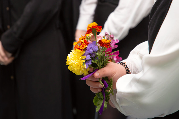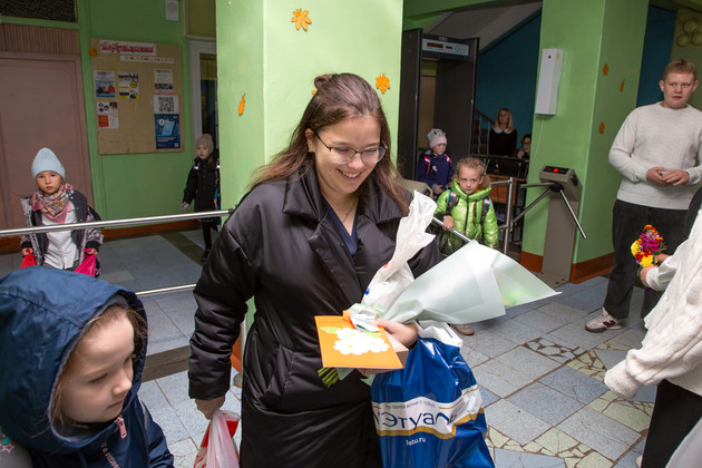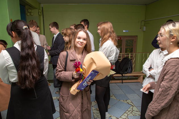 В 7:30 ученики встречают учителей у входа в школу с цветами, открытками и шариковыми ручками. Звучит праздничная музыка. Настроение у всех приподнятое.