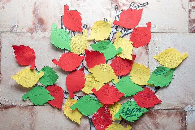- Видите, какое праздничное дерево изготовили наши ученики? - Людмила Александровна подводит меня к импровизированной инсталляции. На стене в виде дерева прикреплены бумажные листья с написанными пожеланиями в адрес любимых учителей.